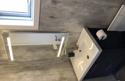 Private bathroom with a toilet, shower, and a nice lighting mirror over a sink. Towels are included. Hand- and bath soap is ready to be used.
